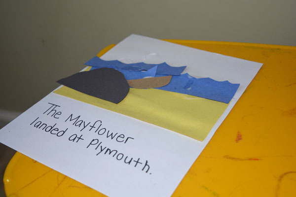After the Thankfulness Tree, it was time to create page three of our “My Thanksgiving Book.”  Today’s page was a depiction of the Mayflower landing at Plymouth Rock.  As they glued it all together, we talked about life aboard the ship, how happy they must have been to find land, and then the shock of landing in such a foreign environment.